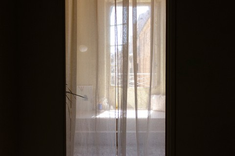 On y pénètre par un petit vestibule, carrelé au sol, séparé de l’espace principal par un rideau blanc qui laisse entrevoir le reste de la pièce. Préambule au salon, on est invité à s’y déchausser. Passé ce filtre, on accède au cœur de la pièce. Le sol est couvert de paille de riz tissée. Un muret carrelé court le long des murs et incarne tantôt un accoudoir, un dossier, une bibliothèque, un coin de table… Situé à hauteur de regard lorsqu’on est assis au sol, il prend plus d’ampleur sous la fenêtre, où il forme comme une estrade sur laquelle on peut se prélasser.