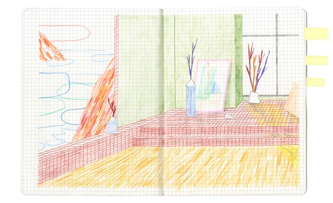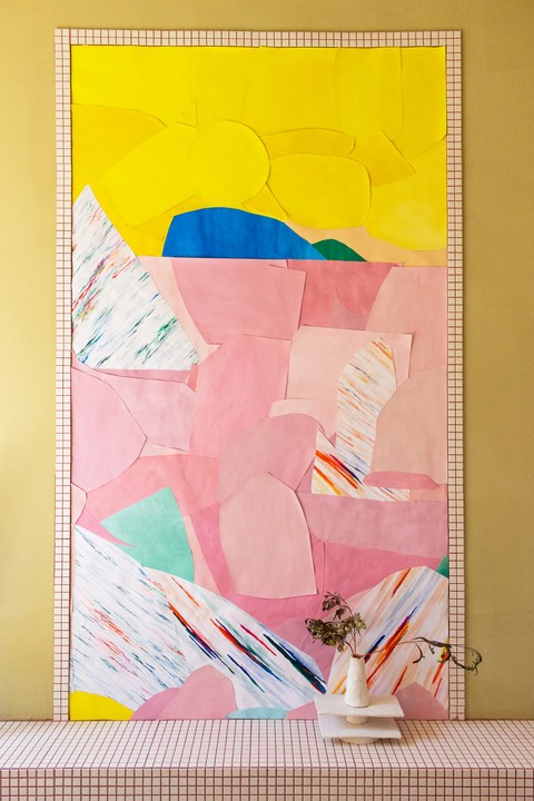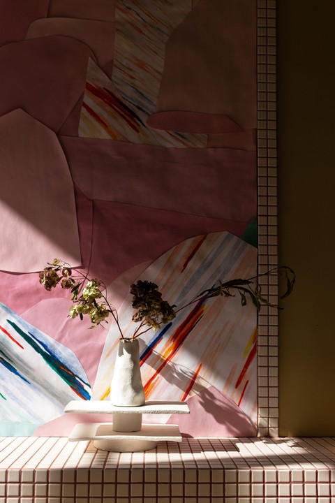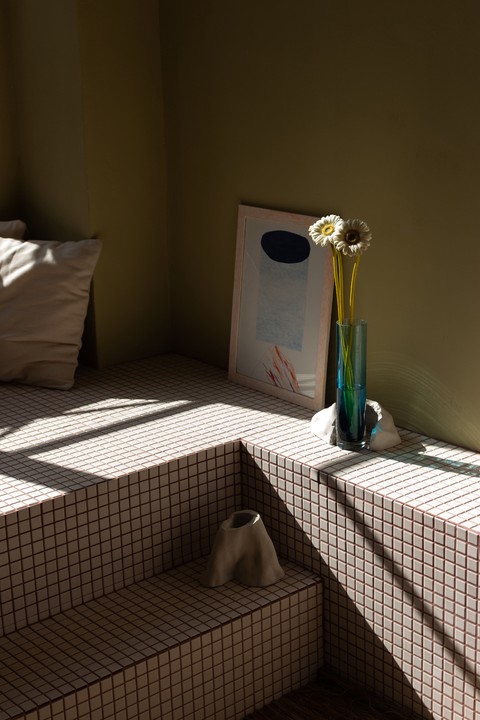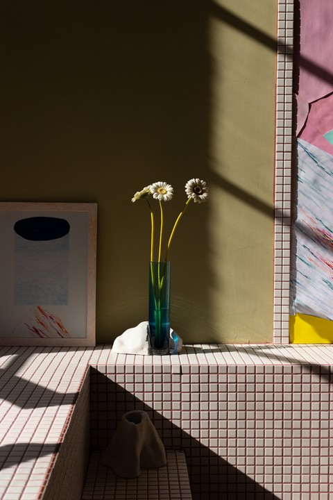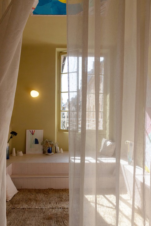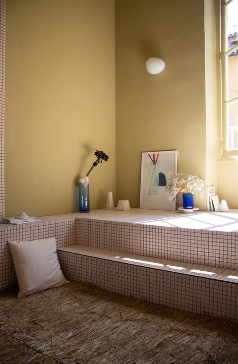 Dans ce lieu désencombré, on est invité à s’approprier l’espace comme on l’entend, à s’asseoir ou s’allonger directement au sol, à attraper un coussin pour y reposer sa tête, ou encore à s’adosser contre le muret.