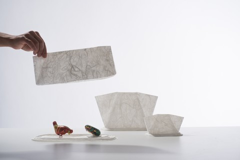 Projet de recherche sur le papier, ses qualités, ses propriétés ainsi que sur sa mise en forme, à travers la technique du gaufrage. Cette exploration s’incarne dans une série de surfaces texturées et une gamme de cloches en papier washi.